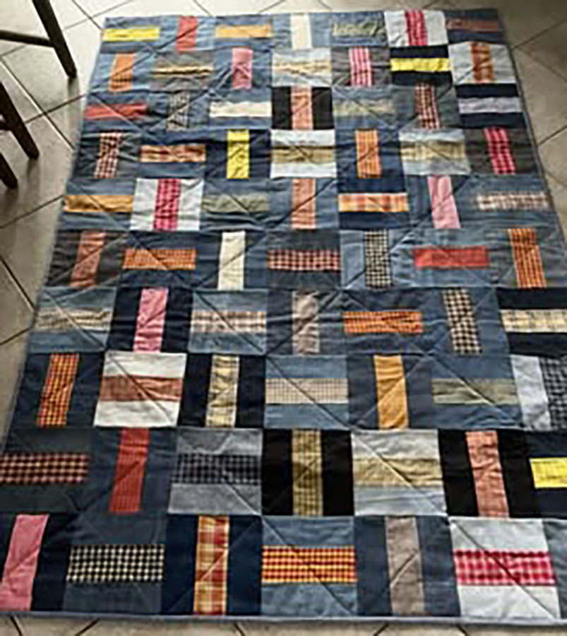 Ann-Leila Sønderby, Vordingborg, har syet det fine strimmeltæppe og 5 par grydelapper.