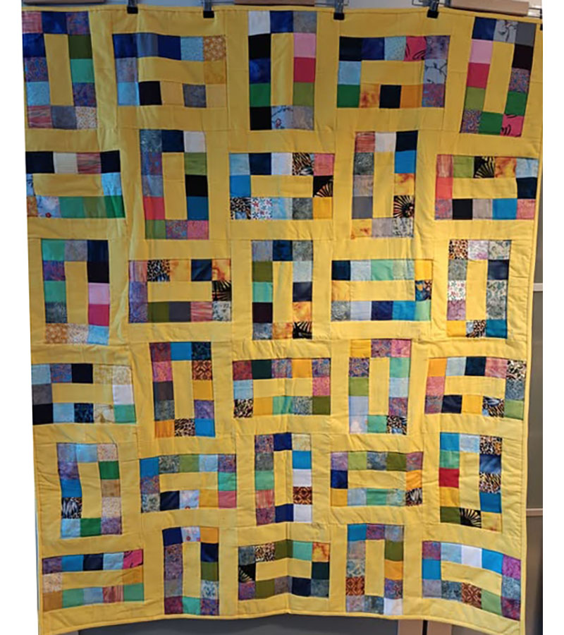 Gule stolper 26. februar 2026 Af projektputte Toppen er syet af Lone Ferløv, mellemfoer fra bogsalg, bagside doneret af Lone Ferløv. Ane-Marie Ridder har monteret og quiltet .