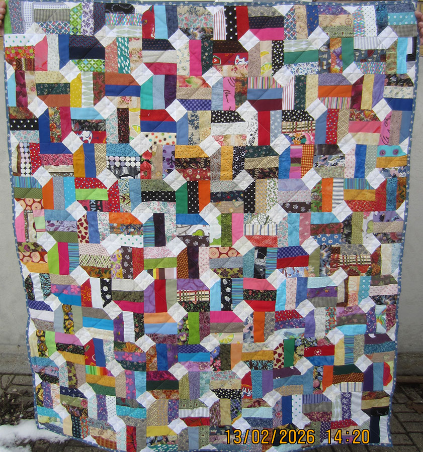 Lissy Kristensen, Hobro, har syet puttetæppet af blokke bestående af tre rektangler og to hvide trekanter i modstående hjørner – ganske virkningsfuldt. Mellemfor er doneret af Viborg Patchworkforenings Velgørenhedsgruppe, og bagsiden er fra tantetræf.