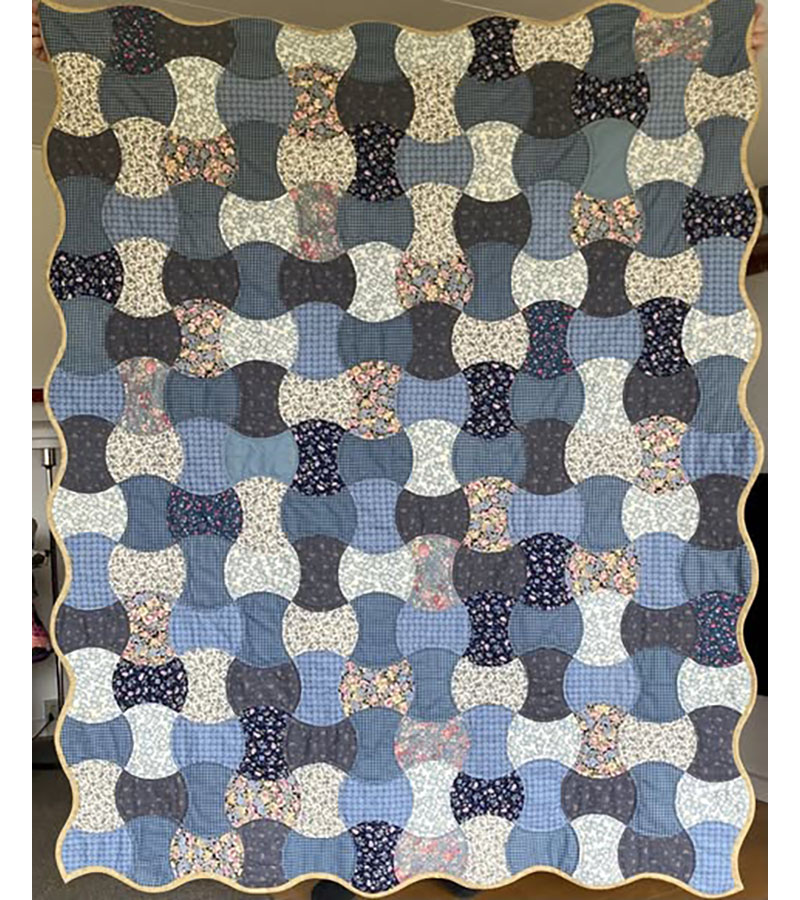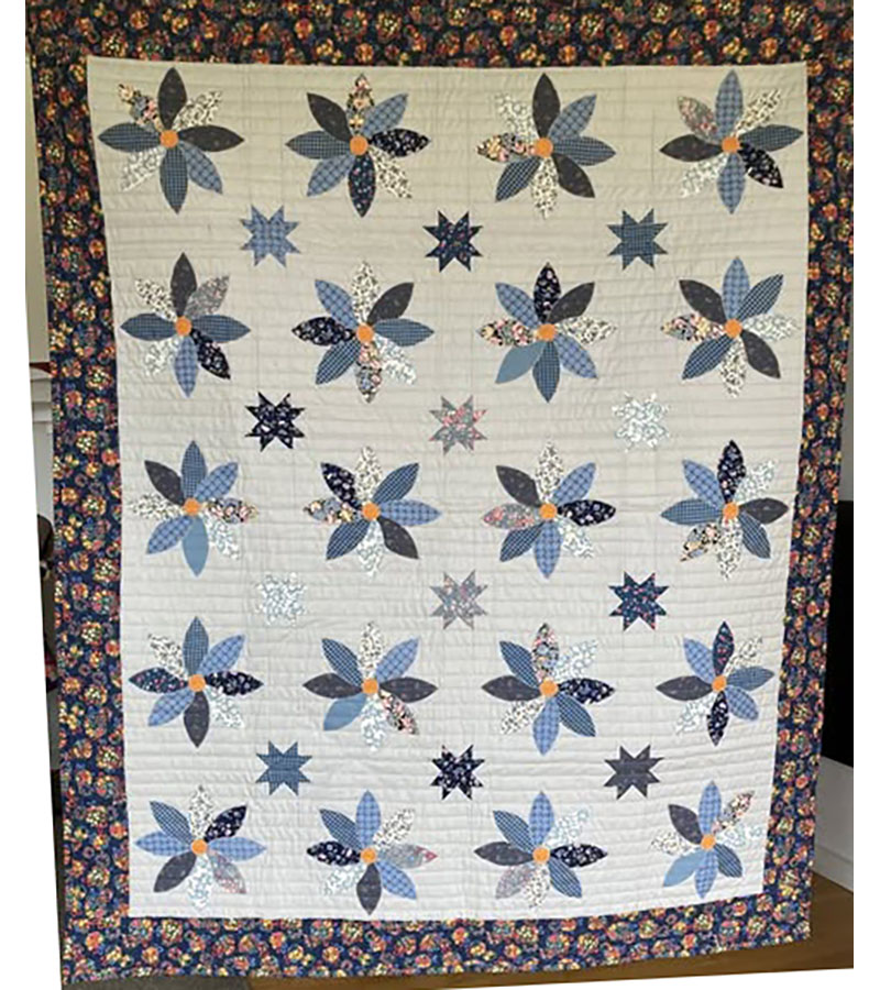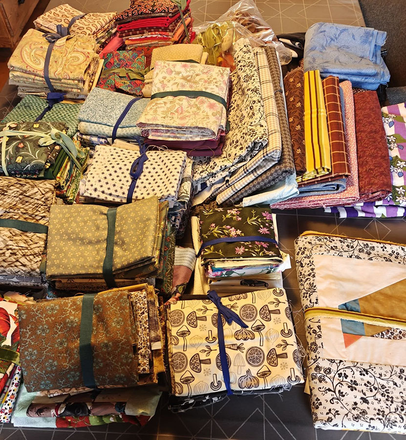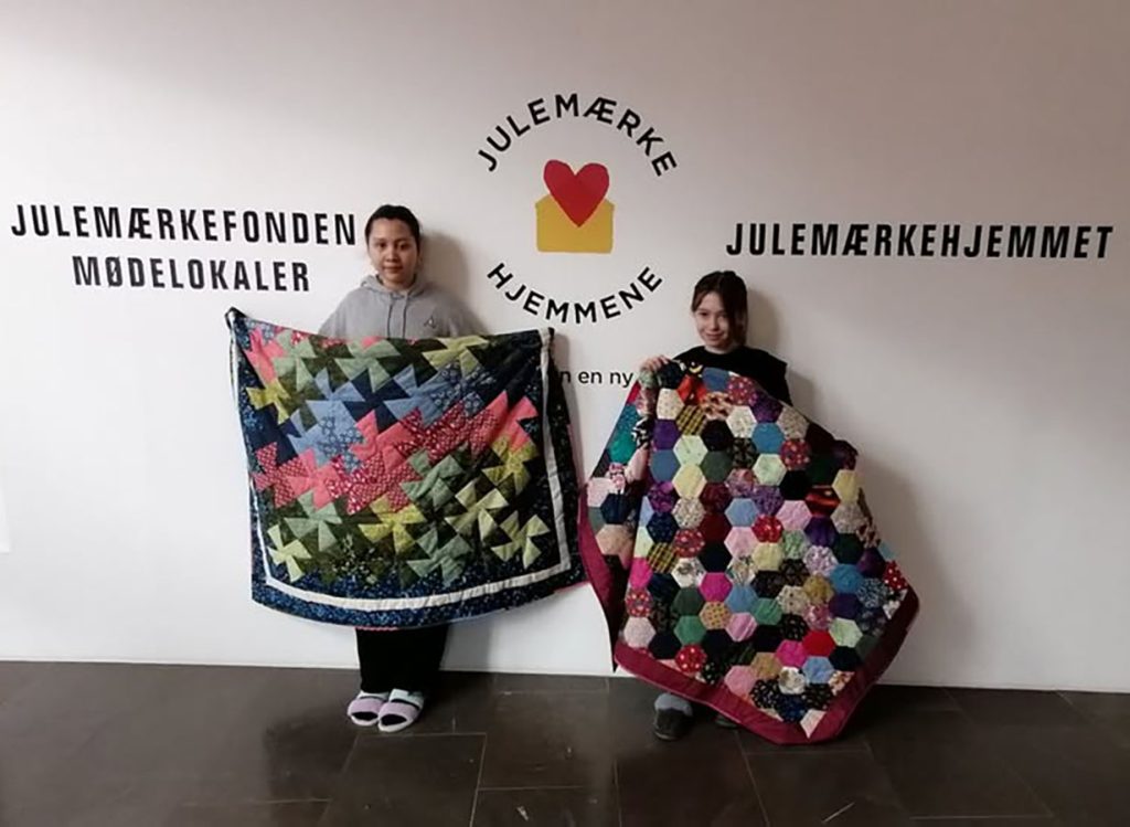 Anette Kaufmann Laursen har to tæpper klar til aflevering. Stoffet til Apple Core quilten er doneret af 2 søstre, der er stoppet med at sy patchwork. Blomsterne og stjernerne i det andet tæppe er “fraklippet”/ resterne fra Apple core quilten.