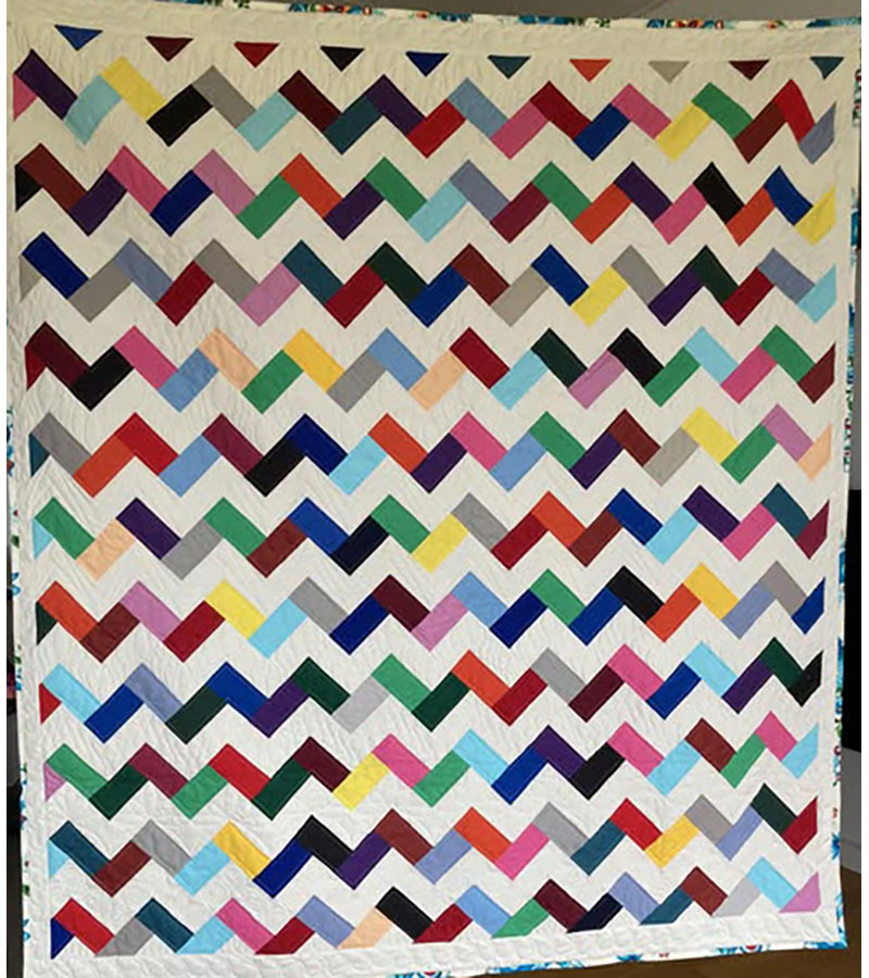 Anette Kaufmann Laursen har et tæppe klart til aflevering. Mønsteret hedder Spiny Peaks og er fundet på nettet. Alle de farvede stykker er smårester fra andre projekter.