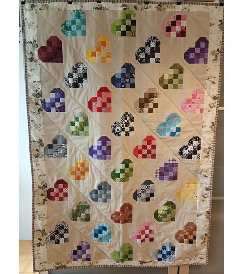 Denne fine top med hjerter i hele farvepaletten er syet af Lisa Pedersen, Odense. Mellemfoer fra bogsalg. Bagside en donation. Alis Vesterbjerg Nielsen, Nyborg, har monteret og quiltet. Der er taget en række af, så tæppet holdes indenfor målene.