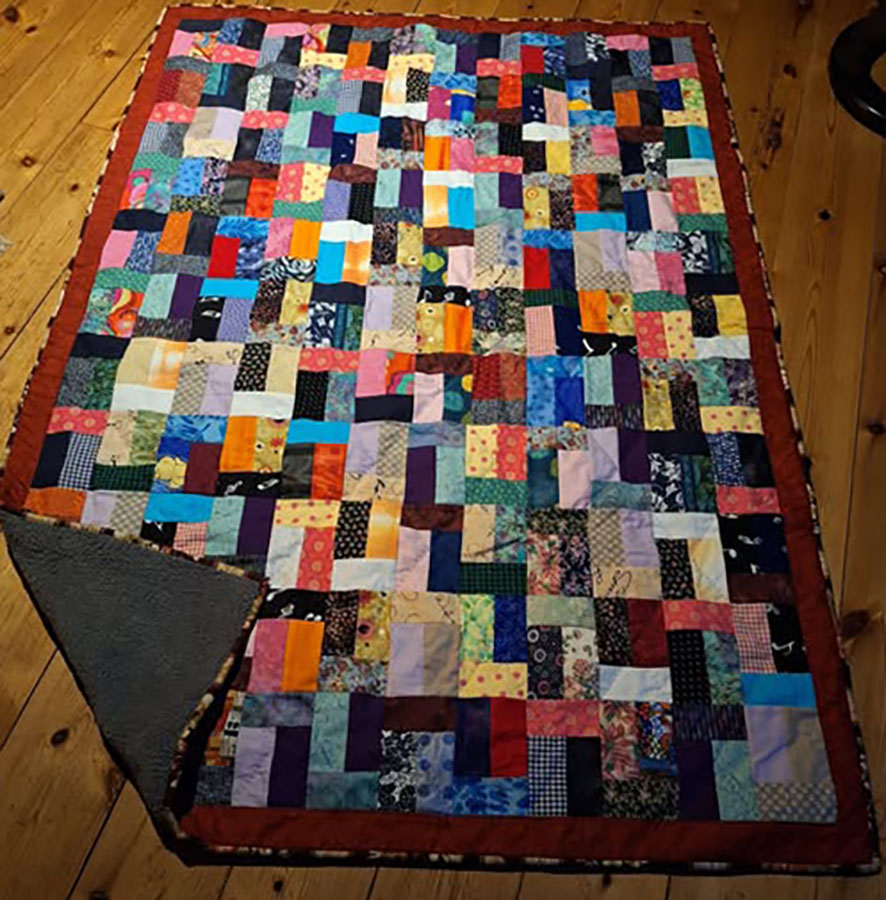 Bente Gaard har syet restetæppet af donerede og egne rester. Der er fleece på bagsiden.
