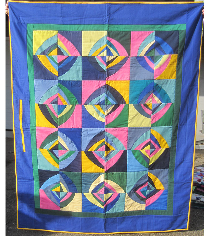 Lene Holst, Thisted, har syet puttetæppe med nogle sjove blokke. Mellemfor er fra egen rulle, bagside er doneret af Inger Veng, øvrige materialer hentet på tantetræf og fra egne gemmer.