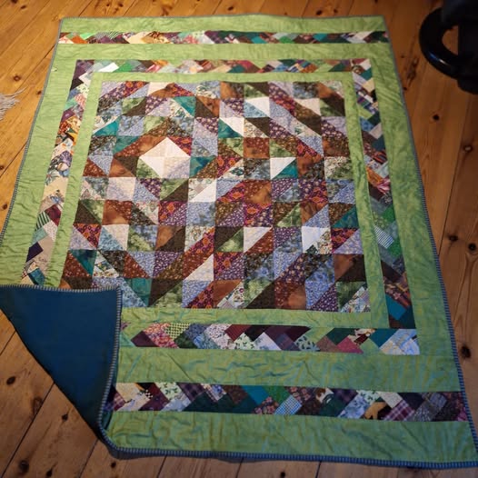 Doneret midterstykke 16. april 2026 Af projektputte Midterstykket er doneret fra et dødsbo, Bente Gaard har syet tæppet færdigt. Der er fleece på bagsiden.