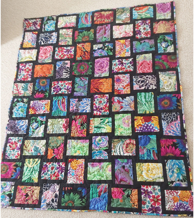 Flotte blomster 16. april 2026 Af projektputte Susse Monefeldt er mester for dette smukke puttetæppe, hvor der er brugt storblomstrede stoffer indrammet med sorte stolper.