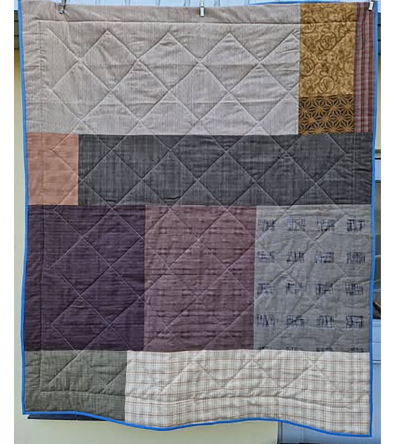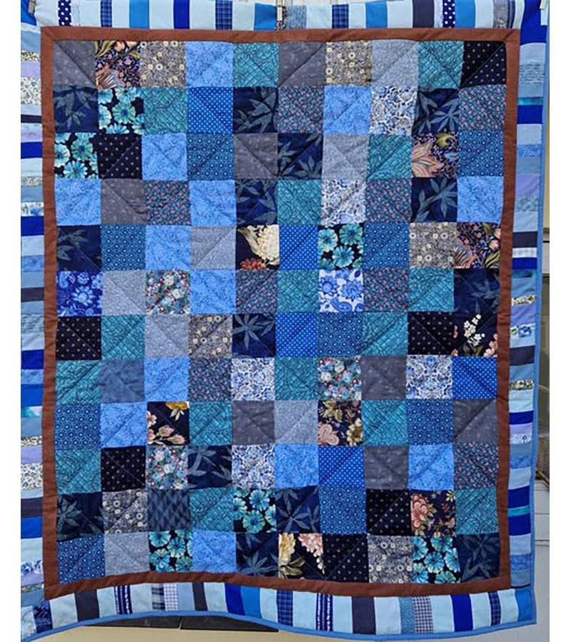 Blåt og brunt 27. april 2026 Af projektputte Midterfeltet til dette blå tæppe er doneret af Birgit Hansen, Ørslev. Forstørret af Lisbeth Adrian, der også har monteret med bagside af japanske stoffer og mellemfor fra Hella Jacobsen.