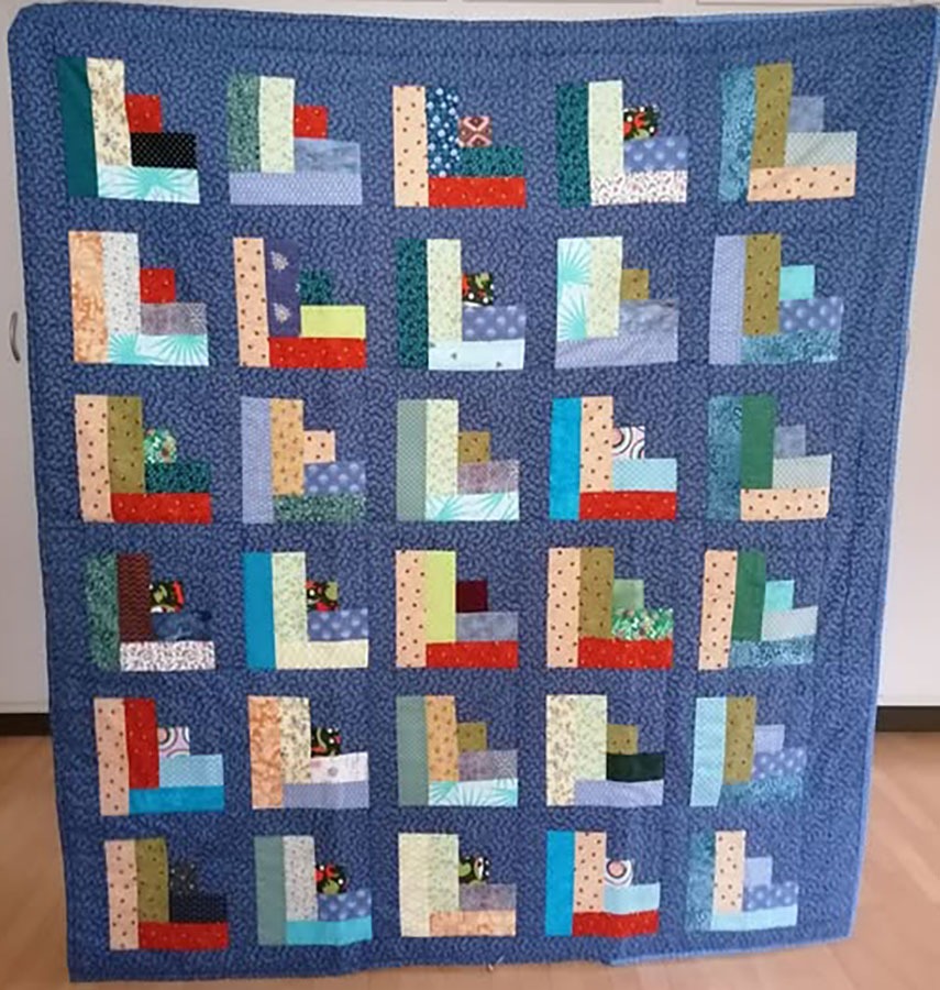 Blåt tæppe med Log C abin 28. april 2026 Af projektputte Kate Dideriksen, Birkerød har syet dette fine tæppe, hvor stofferne er doneret af Ninette Menå, Virum. Mønsteret er fra Hanne’s Patchwork “resteræs 26”