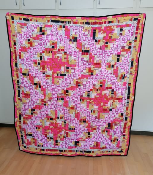Pink puttetæppe 28. april 2026 Af projektputte Pia Juul Jensen, Skævinge har syet denne pinkfarvede top. Inger Olsen har færdigmonteret med mellemfor fra bogsalg og bagside fra donation.